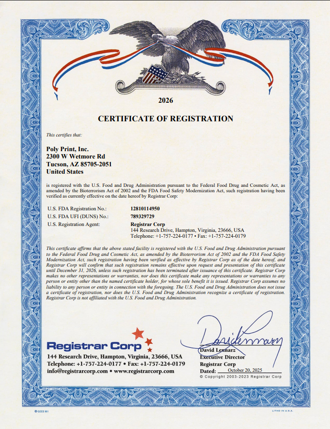 The Safe Quality Food (SQF) Food Safety program and certification ensure the safety and quality of food and food packaging products through an internationally recognized certification system, featuring an emphasis on the systematic application of a Hazard Analysis Critical Control Point (HACCP) plan for control of food safety hazards. The implementation of an SQF management system addresses our customers’ food safety requirements. Although Poly Print does not manufacture or handle food products directly, packaging is considered an “ingredient” of the final packaged product, and our SQF certification ensures that our products, materials and processes are safe for direct food contact.