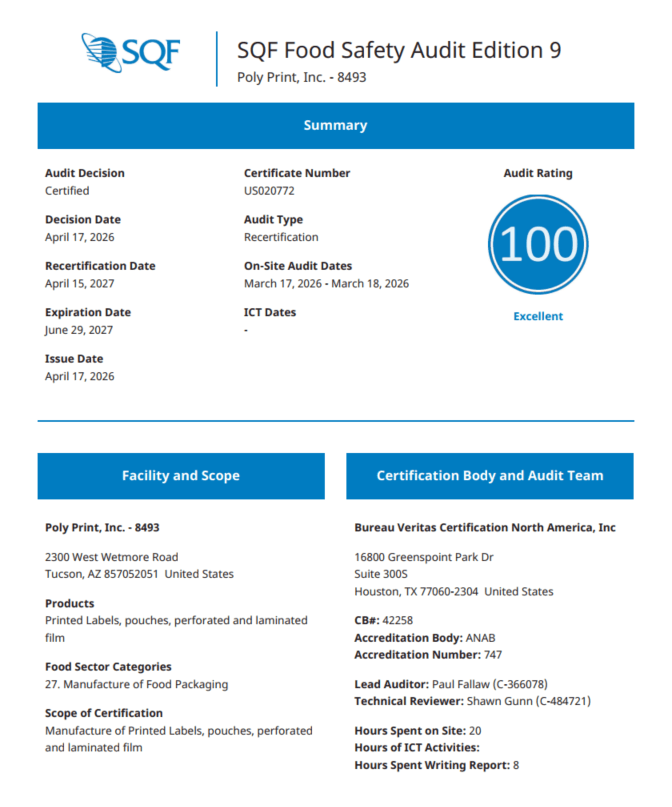Poly Print has earned a perfect 100/100 score in a recent UNANNOUNCED SQF Food Safety and Quality audit. This perfect score marks the second time Poly Print has earned a perfect 100/100 score, the first being in 2020. Poly Print has been SQF certified for both Food Safety and Quality since 2014.